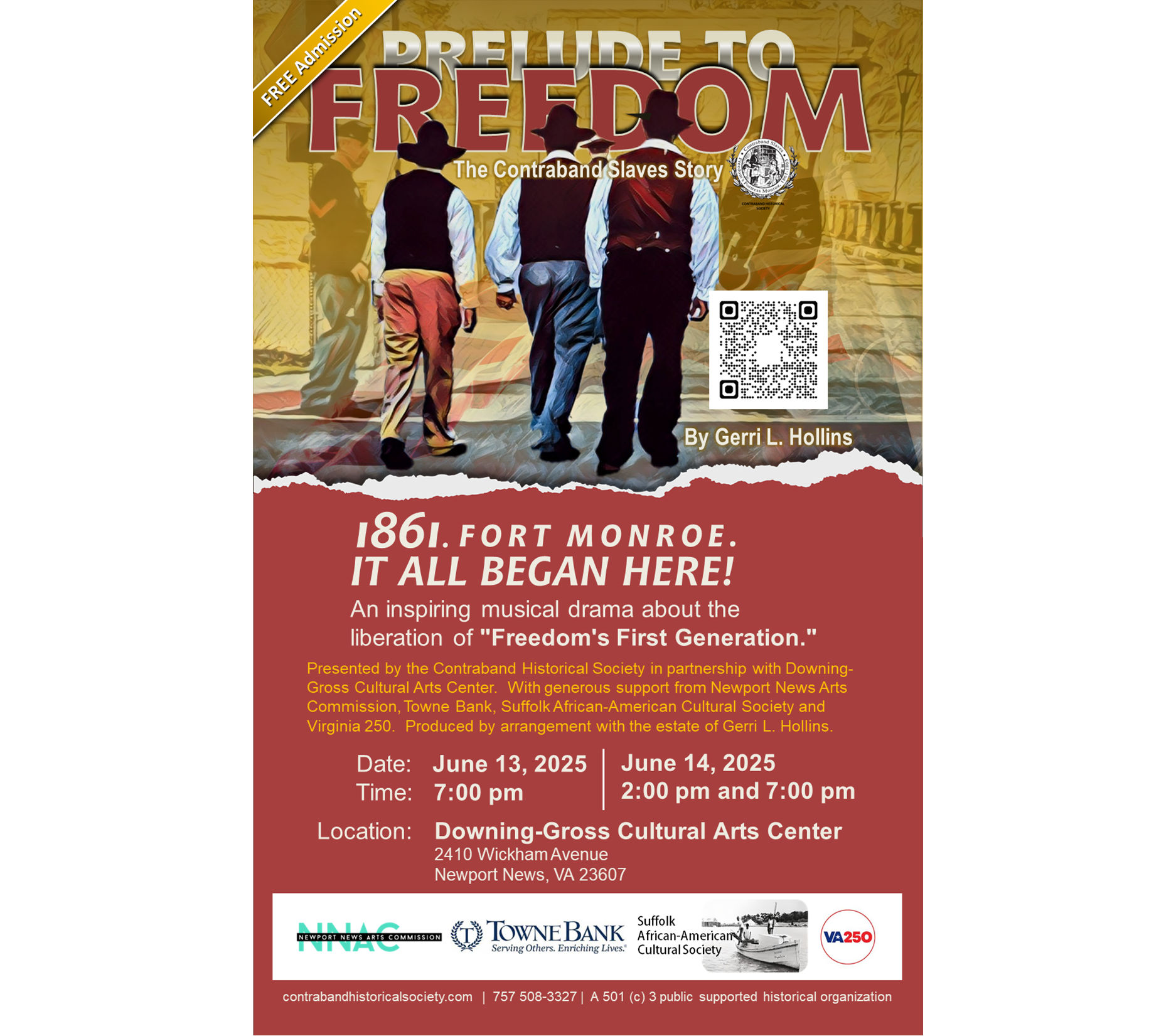 “Prelude to Freedom” was composed and written by Gerri L. Hollins, an accomplished musician, founder of the Contraband Historical Society, and a direct descendant of the first “Contrabands.” The drama combines stirring original music with gripping historical storytelling, drawing on real family struggles and the courageous acts of those who dared to seek freedom in 1861.